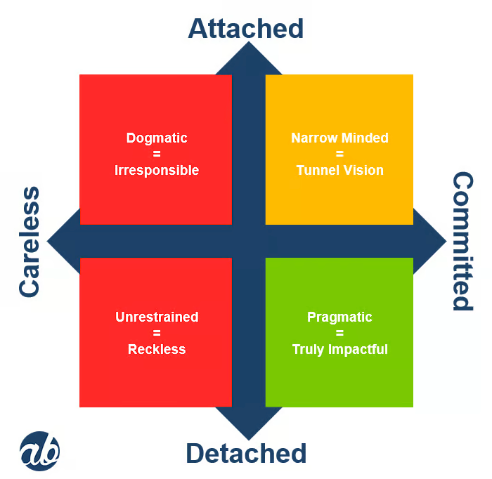 Being attached and careless is also far from where we want to be. This is the space where it's easy to hang our hats on beliefs and statements that aren't relevant or useful to the outcomes we're responsible for delivering right now.