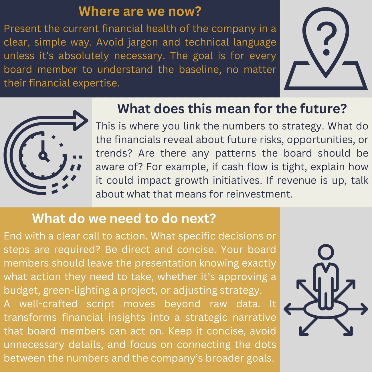 End with recommendations – Close with specific, actionable recommendations.What decisions need to be made today? What are the next steps? By ending with a call to action, the CFO will leave the board with a clear path forward.
