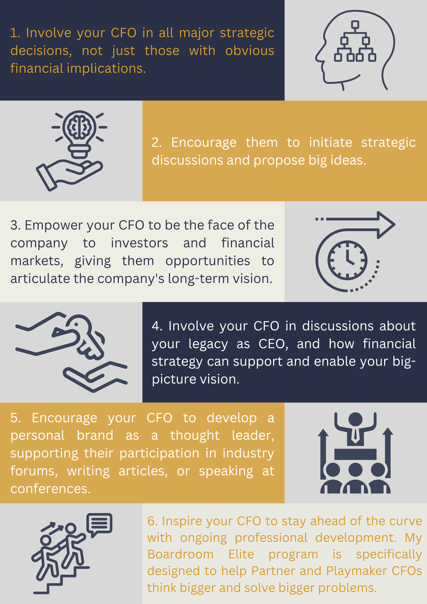 Playmaker CFOs build upon the strengths of the Partner. The transition from Partner to Playmaker is marked by a shift from strategic guide to visionary leader.