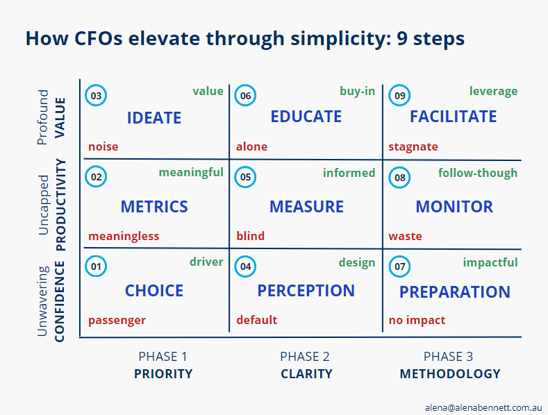 Within those phases, we identify the steps and bespoke sequence of success for each of my CFOs so that they can contribute to their organisations in the most valuable and profound ways.