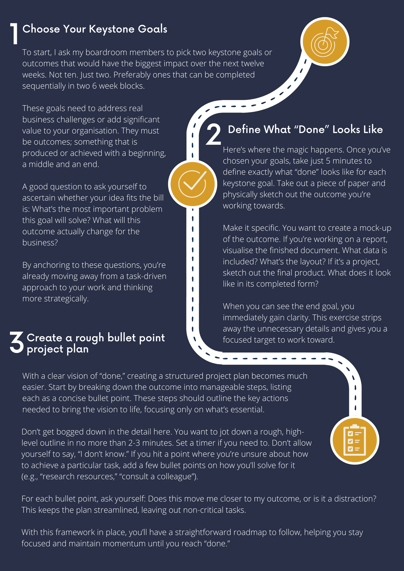 What I see time and again in my boardroom is that the first time someone does this exercise, there's a shift. People have that "lightbulb moment" where they look up and say, "Oh, now I see what I need to achieve." Suddenly, they're more focused. They're no longer overwhelmed by the process because they can visualise the end goal.
