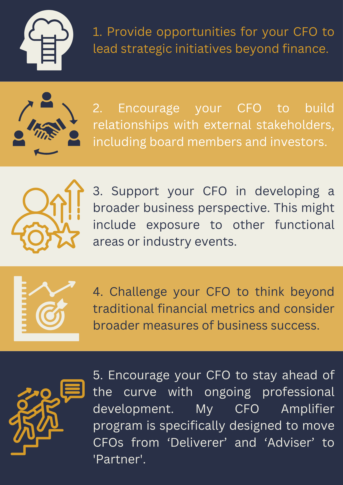 Partner CFOs build upon the strengths of the Adviser, taking on an even more integral role in shaping the organisation's future. They're not just contributing to strategic discussions; they're co-creating the vision alongside the CEO.