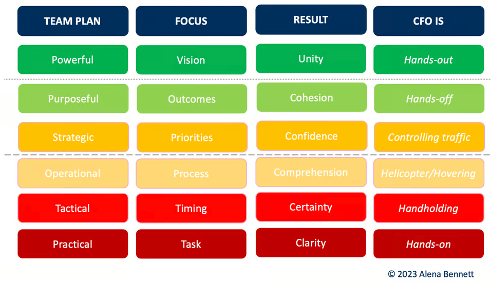 Most CFOs want to develop great strategic plans for their teams. They want them to get strategic so they have the confidence that strategic priorities will be achieved. But a strategic plan is still only in the orange zone because in the orange zone is the there is still a reasonable amount of intervention required by the CFO. The CFO can feel like they're still controlling traffic and without them, decisions wouldn't made, issues not escalated or closed out.