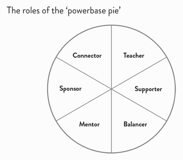 In my first book, Meaning Matters: Results Beyond the Numbers, I discuss the idea of a Powerbase. This is the type of people you need in your world at work to be successful. I've chunked it into 6 pieces of a pie - here are the roles you need: